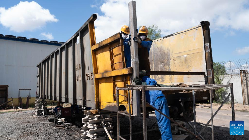 Employees of the China Railway 20th Bureau Group Corporation Limited (CR20) carry out maintenance work on an open wagon in Nacala City, Mozambique, Nov. 24, 2025. (Xinhua/Liu Jie)