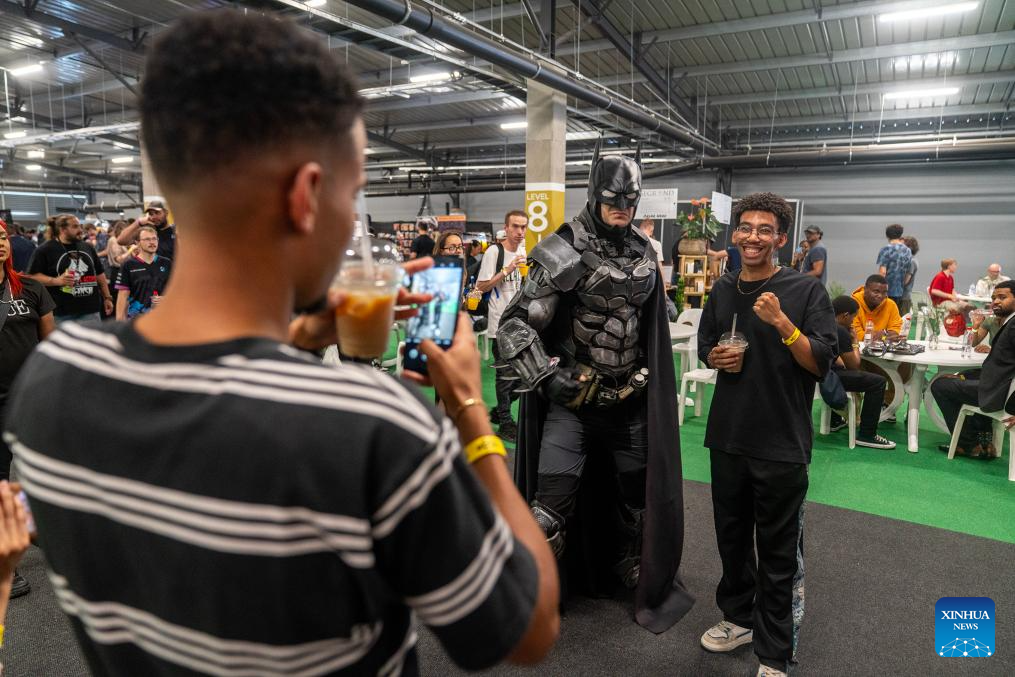 A man poses for a photo with a cosplayer at the rAge Expo 2025 in Johannesburg, South Africa, on Dec. 6, 2025. As South Africa's longest-running game expo, the three-day annual event started here on Friday. (Photo by Shiraaz Mohamed/Xinhua)