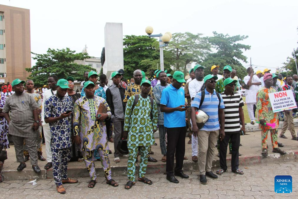 People gather to express their support for Beninese President Patrice Talon at Place Bulgarie in Cotonou, the economic capital of Benin, Dec. 8, 2025.