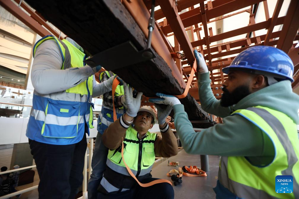 The restoration team work on the restoration project for the ancient King Khufu's second solar boat at the Grand Egyptian Museum in Cairo, Egypt, Dec. 23, 2025. Egypt on Tuesday began reassembling ancient King Khufu's second solar boat at the newly opened Grand Egyptian Museum, a restoration process expected to take about four years and open for visitors to watch live. (Xinhua/Ahmed Gomaa)