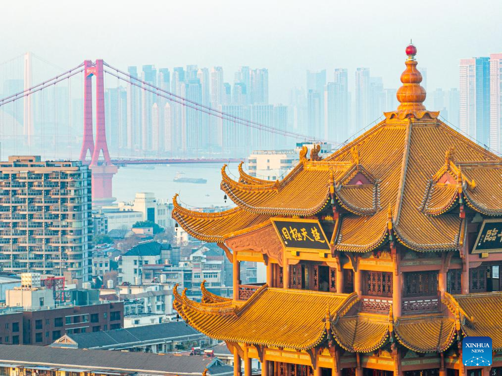 An aerial drone photo taken on Dec. 26, 2025 shows the Yellow Crane Tower at sunrise in Wuhan, central China's Hubei Province. (Xinhua/Xiao Yijiu)
