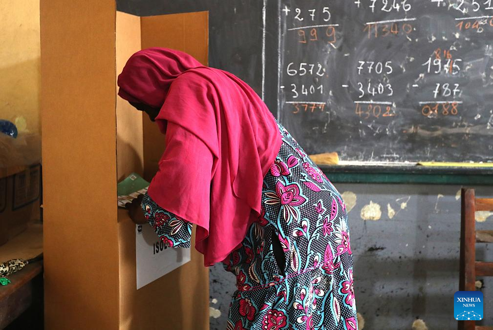 A voter casts her ballot at a polling station in Abidjan, Cote d'Ivoire, Dec. 27, 2025. Polling stations opened on Saturday morning across Cote d'Ivoire for legislative elections to renew the 255 seats of the National Assembly, Xinhua reporters observed on site in Abidjan, the country's economic capital.(Photo by Yvan Sonh/Xinhua)