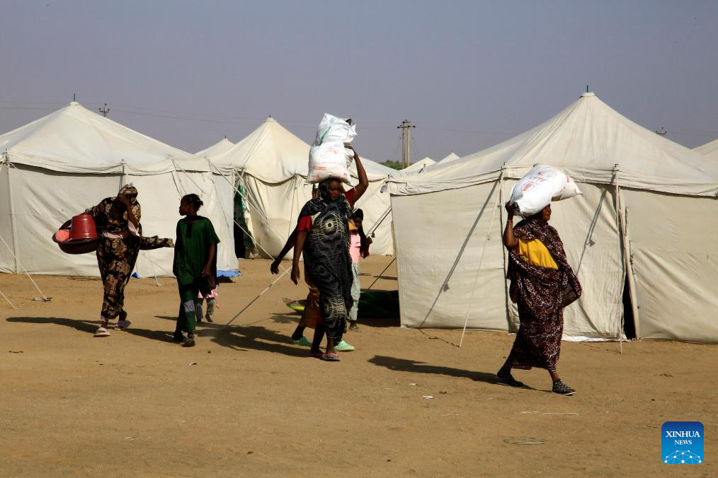 Displaced people carry humanitarian aid at Al-Affad displacement camp in Al-Dabbah city, northern Sudan, Nov. 13, 2025. (Photo by Mohamed Khidir/Xinhua)