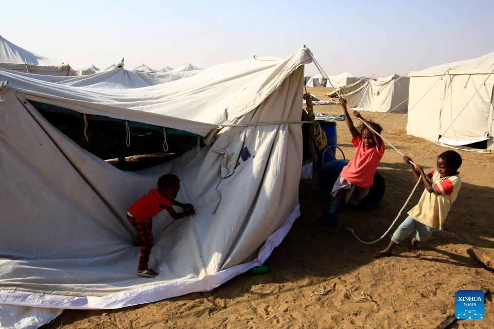 Displaced children attempt to erect a tent at Al-Affad displacement camp in Al-Dabbah city, northern Sudan, Nov. 13, 2025. (Photo by Mohamed Khidir/Xinhua)