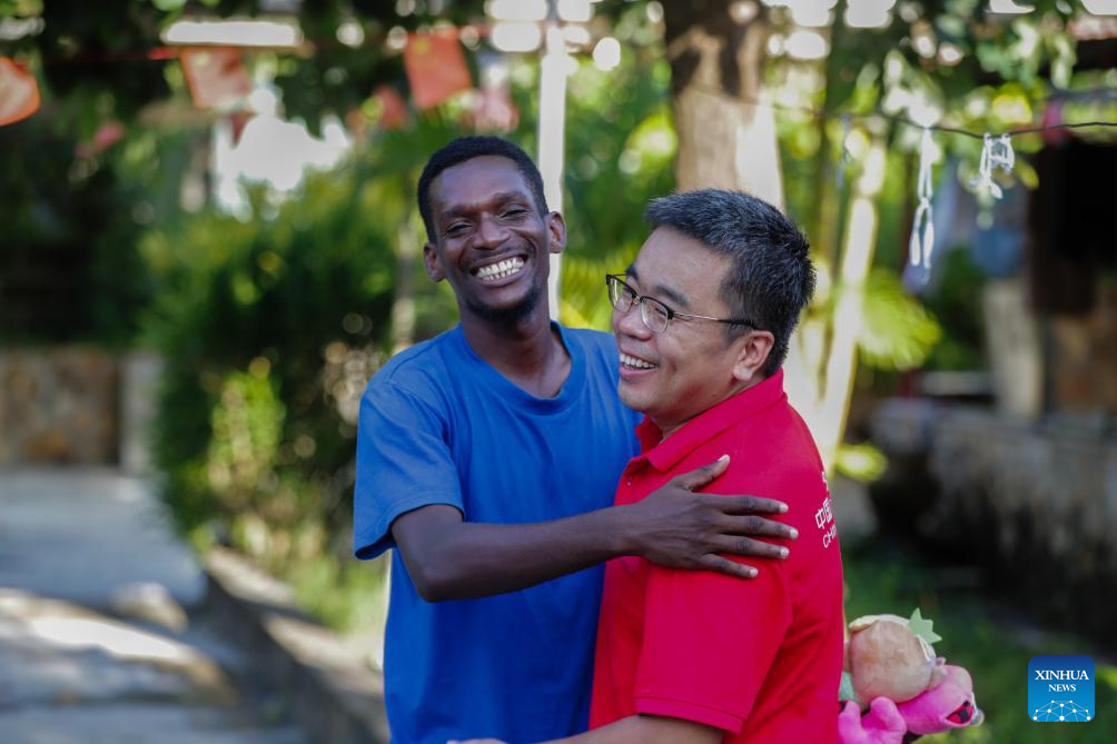 Tanzanian doctor Harun Maisara Mahkum (L) hugs He Zhilong, an otolaryngologist with the 35th Chinese medical team in Zanzibar, in Abdulla Mzee Hospital on Pemba Island, Zanzibar, Tanzania, on Jan. 1, 2026. (Xinhua/Emmanuel Herman)