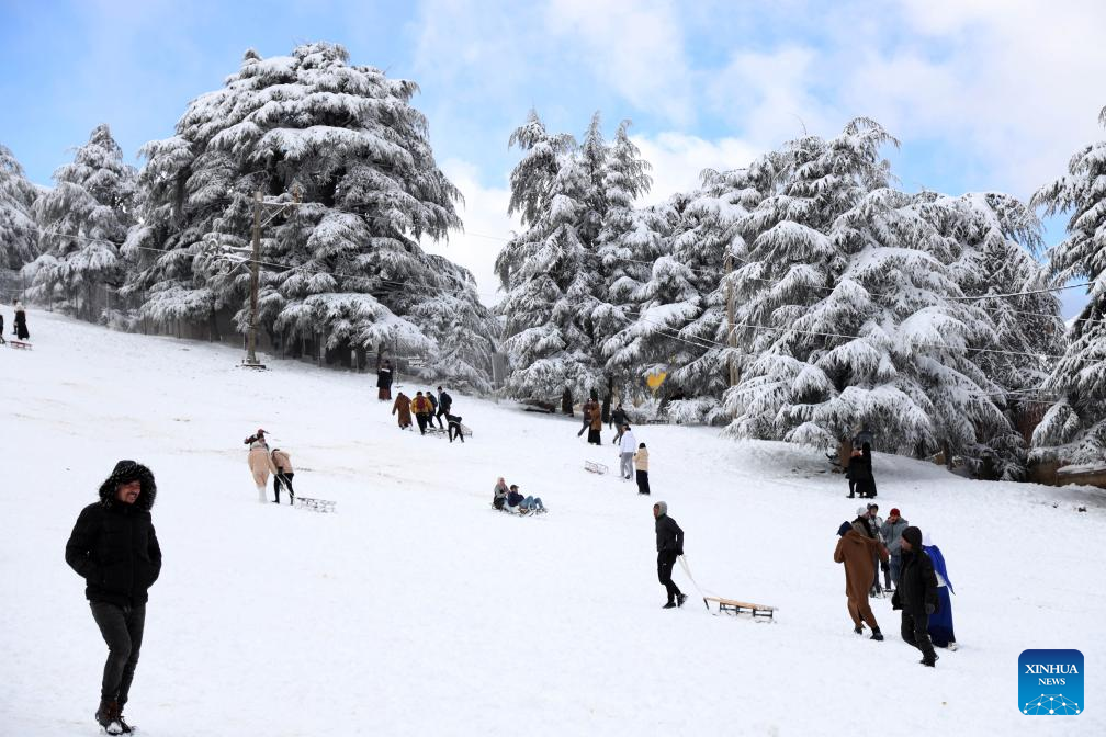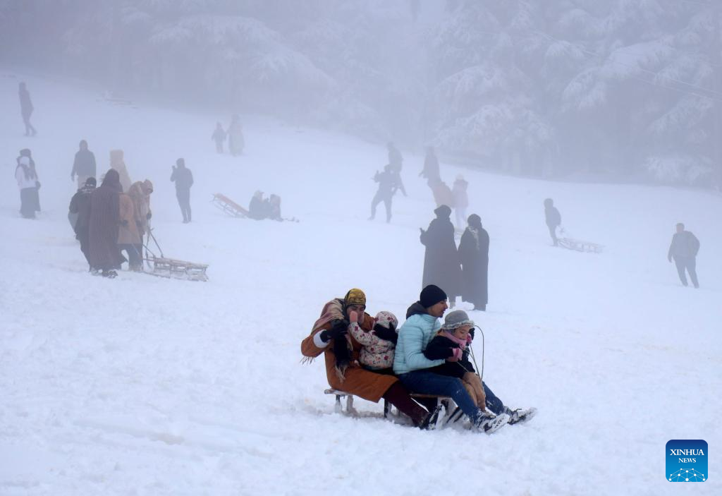 People enjoy the snow at Chrea National Park in Blida province, Algeria, Jan. 7, 2026. (Xinhua)