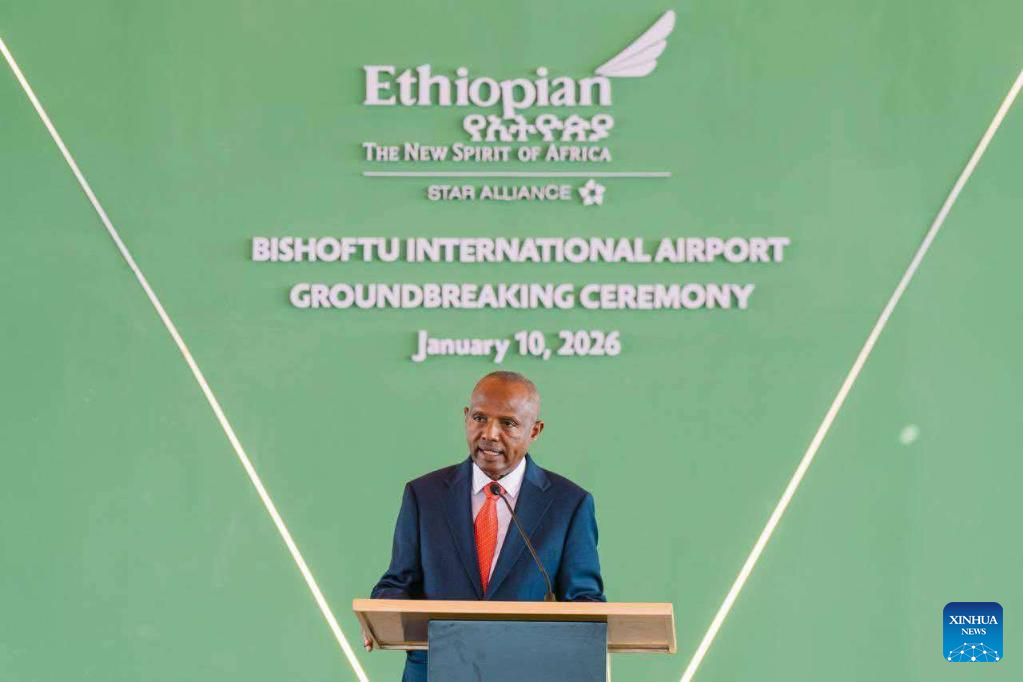 Mesfin Tasew, group chief executive officer of Ethiopian Airlines Group, speaks at the groundbreaking ceremony of the Bishoftu International Airport, near Bishoftu town in the Oromia regional state of Ethiopia, on Jan. 10, 2026. Ethiopian Prime Minister Abiy Ahmed on Saturday officially launched the construction of the Bishoftu International Airport, which is expected to become Africa's largest aviation hub upon completion.(Ethiopian Airlines Group/Handout via Xinhua)