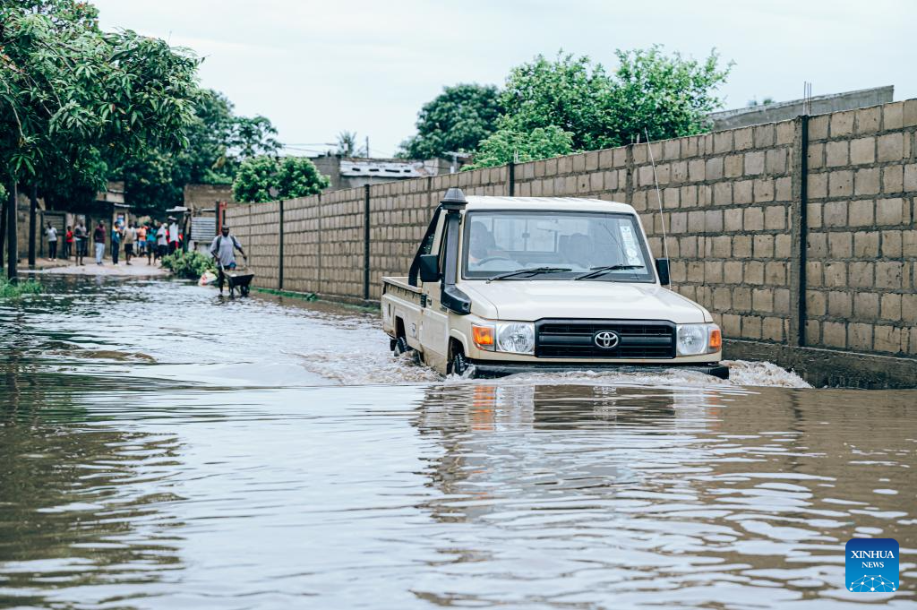 A car drives through floodwater caused by heavy rainfall in Matola City, Maputo Province, Mozambique, Jan. 12, 2026. Mozambique is currently in the peak of its rainy season, a period marked by frequent alerts for heavy rains and strong winds, particularly in the central and southern regions. (Photo by Mendes Mondlane/Xinhua)