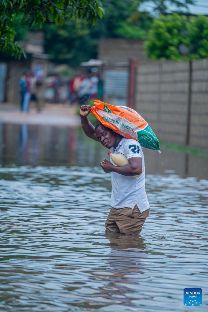A resident wades through floodwater caused by heavy rainfall in Matola City, Maputo Province, Mozambique, Jan. 12, 2026. Mozambique is currently in the peak of its rainy season, a period marked by frequent alerts for heavy rains and strong winds, particularly in the central and southern regions. (Photo by Mendes Mondlane/Xinhua)