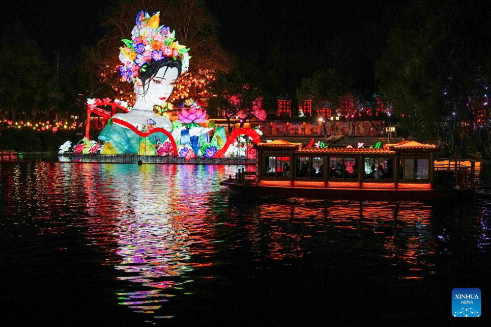 This photo taken on Jan. 21, 2026 shows light decorations displayed at the Bailuzhou Park during the 40th Qinhuai Lantern Festival in Nanjing, east China's Jiangsu Province. The lighting ceremony of the festival was held at the Bailuzhou Park on Wednesday. The festival can be visited in several exhibition areas near the Qinhuai river in the city of Nanjing. (Xinhua/Li Bo)