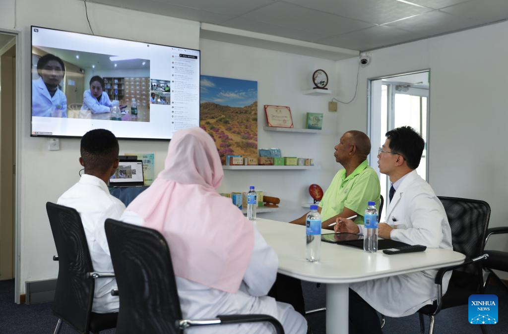 Experts from the Chengdu Second People's Hospital in China participate remotely in an online consultation for patient Jabulane Ngwenwa (2nd R) at the African Center for Traditional Chinese Medicine and Acupuncture in Johannesburg, South Africa, Jan. 21, 2026. (Xinhua/Chen Wei)
