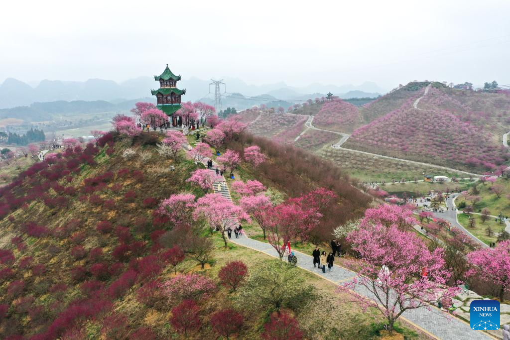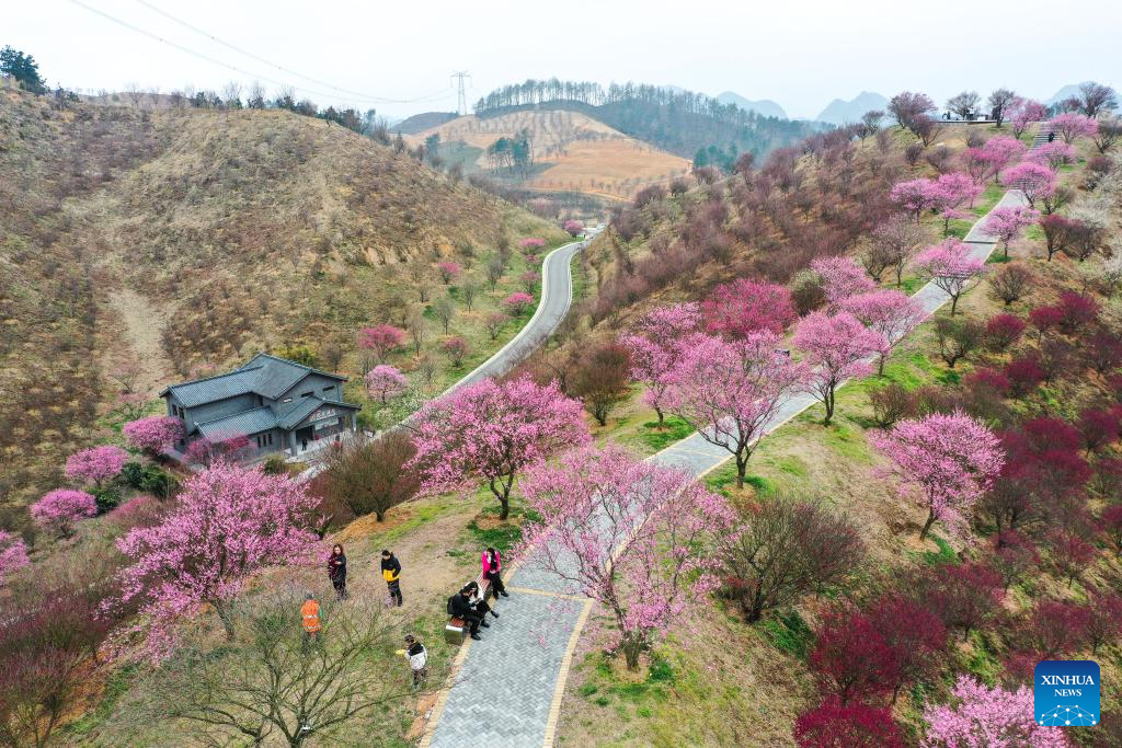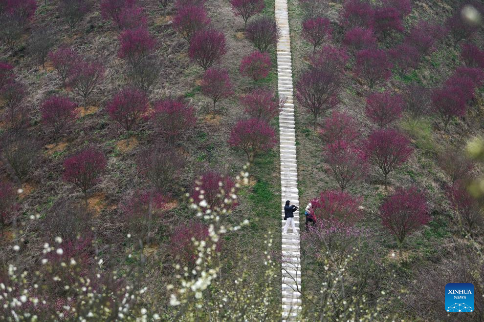 An aerial drone photo taken on Jan. 24, 2026 shows people visiting a plum blossom garden in the Guian New Area, southwest China's Guizhou Province. Covering an area of 1,800 mu (120 hectares), a plum blossom garden opened to the public in Guian New Area on Saturday, attracting tourists for sightseeing. Once an ecologically fragile area, the garden has planted over 50,000 plum blossom trees. (Xinhua/Yang Wenbin)