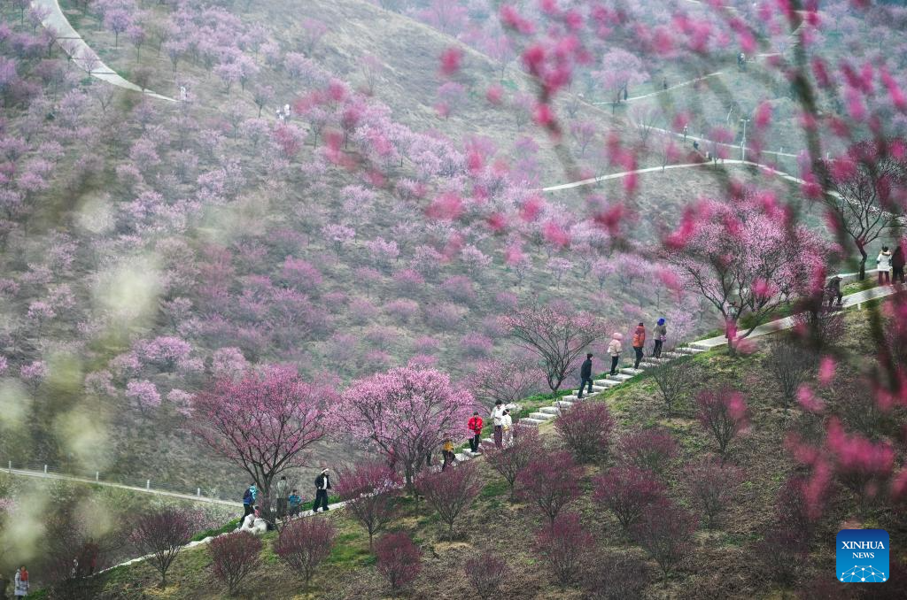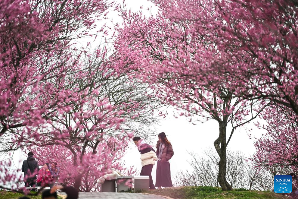 People take photos at a plum blossom garden in the Guian New Area, southwest China's Guizhou Province, Jan. 24, 2026. Covering an area of 1,800 mu (120 hectares), a plum blossom garden opened to the public in Guian New Area on Saturday, attracting tourists for sightseeing. Once an ecologically fragile area, the garden has planted over 50,000 plum blossom trees. (Xinhua/Yang Wenbin)
