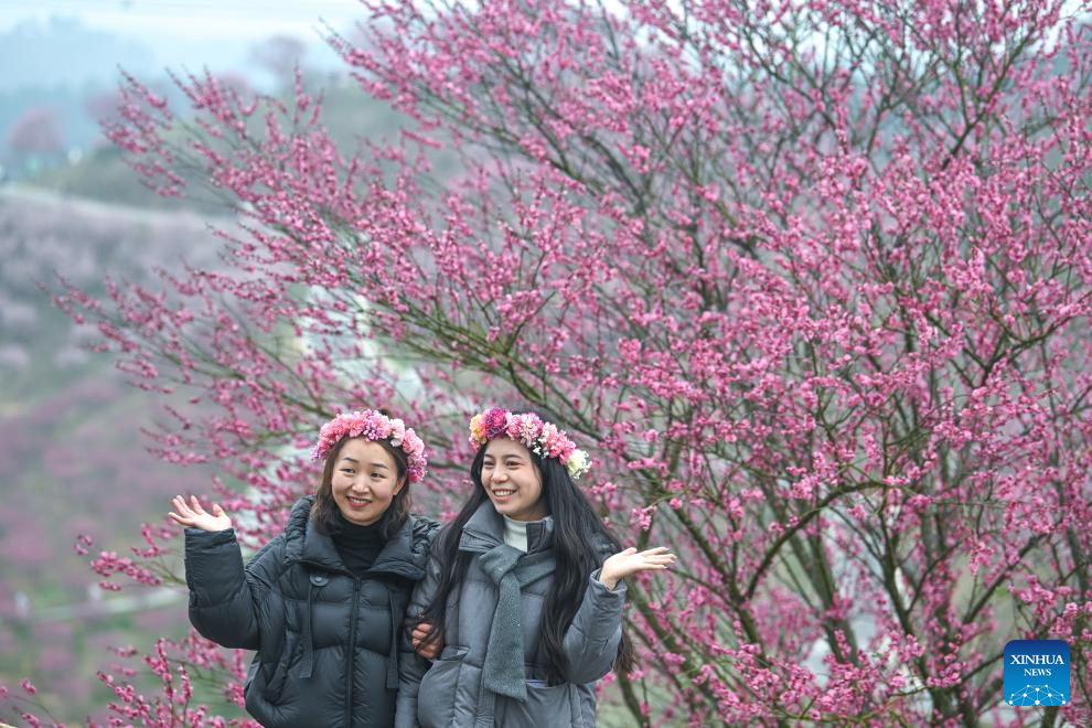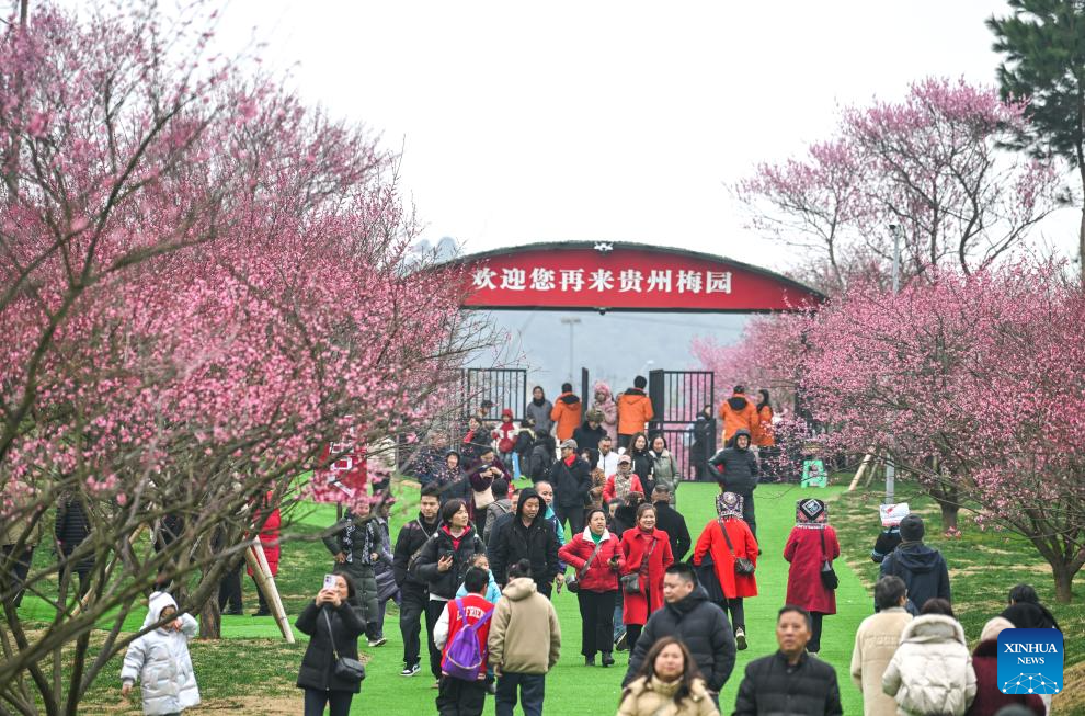 Visitors pose for photos at a plum blossom garden in the Guian New Area, southwest China's Guizhou Province, Jan. 24, 2026. Covering an area of 1,800 mu (120 hectares), a plum blossom garden opened to the public in Guian New Area on Saturday, attracting tourists for sightseeing. Once an ecologically fragile area, the garden has planted over 50,000 plum blossom trees. (Xinhua/Yang Wenbin)