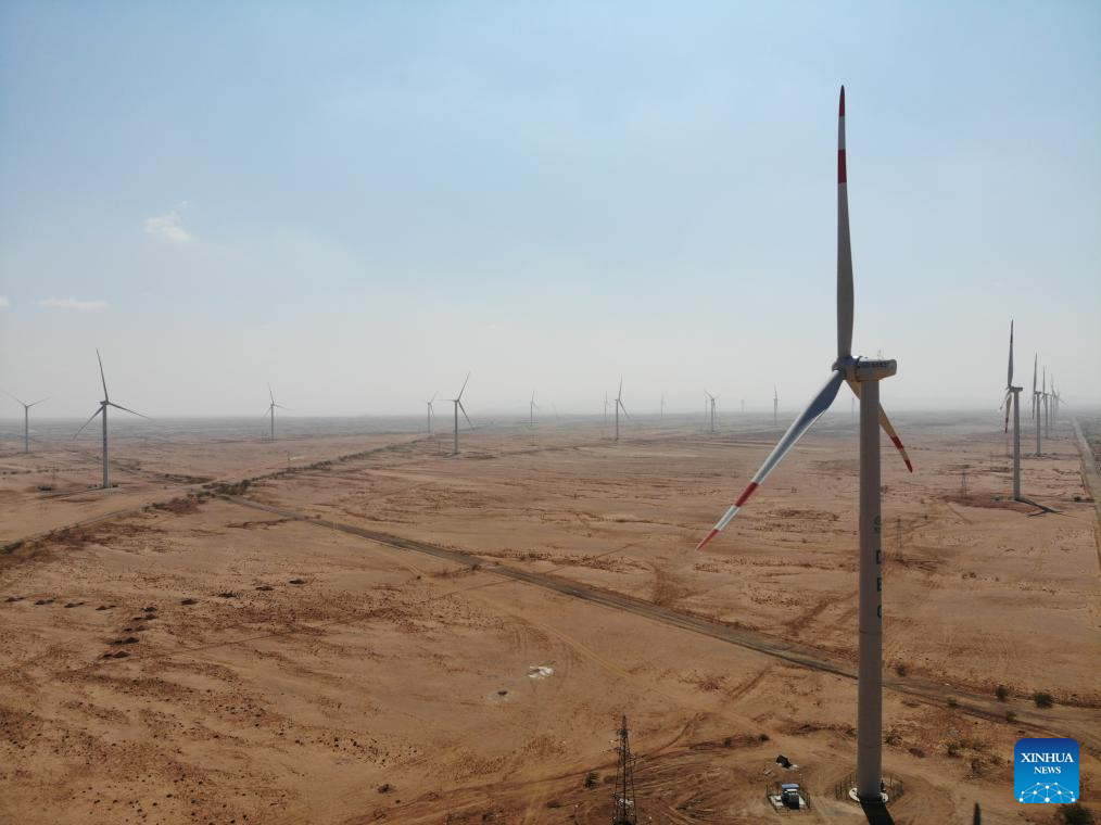 This undated file photo shows a view of the Aysha II Wind Power Plant in Somali Regional State, Ethiopia. Ethiopian Prime Minister Abiy Ahmed on Saturday inaugurated the first phase of the Aysha II Wind Power Plant in Somali Regional State, stressing that clean energy development is central to the country's long-term economic transformation. (Dongfang Electric Corporation/Handout via Xinhua)