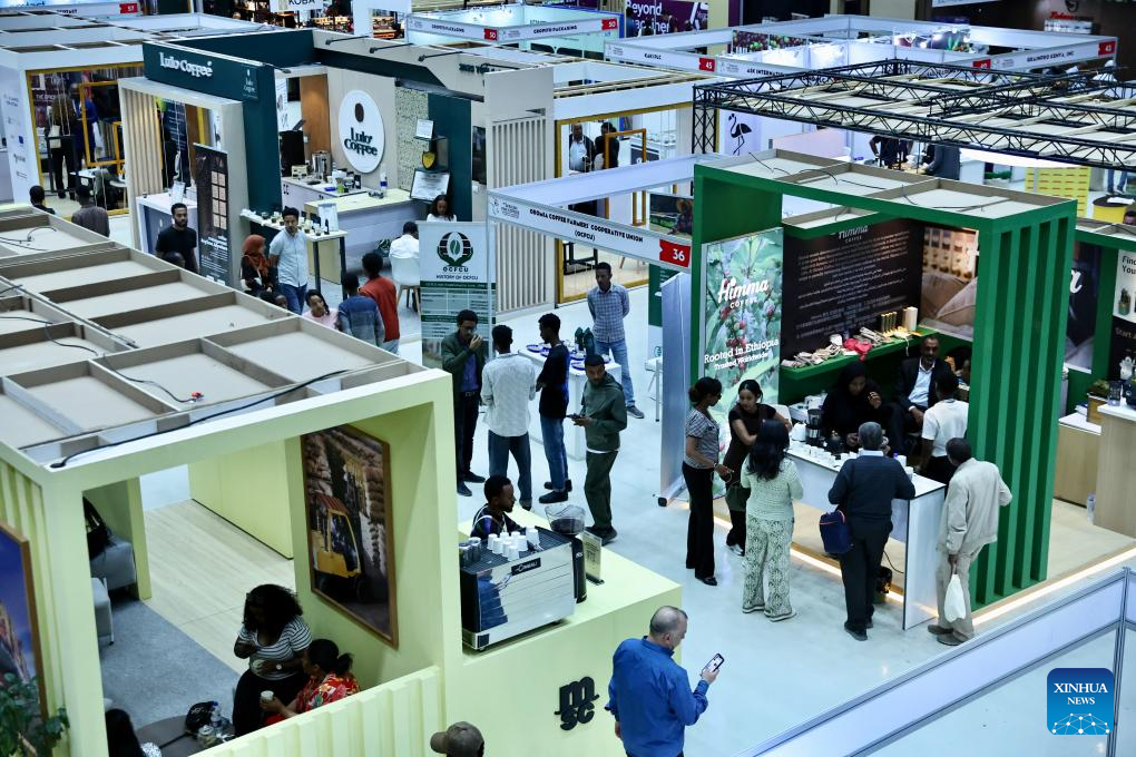 People visit the 22nd African Fine Coffees Conference and Exhibition in Addis Ababa, Ethiopia, Feb. 6, 2026. The 22nd African Fine Coffees Conference and Exhibition, running from February 4 to 6, 2026, has brought together producers, exporters, traders, roasters, investors, policymakers, and development partners to promote African coffee excellence and strengthen global market linkages. (Xinhua/Geng Xinning)