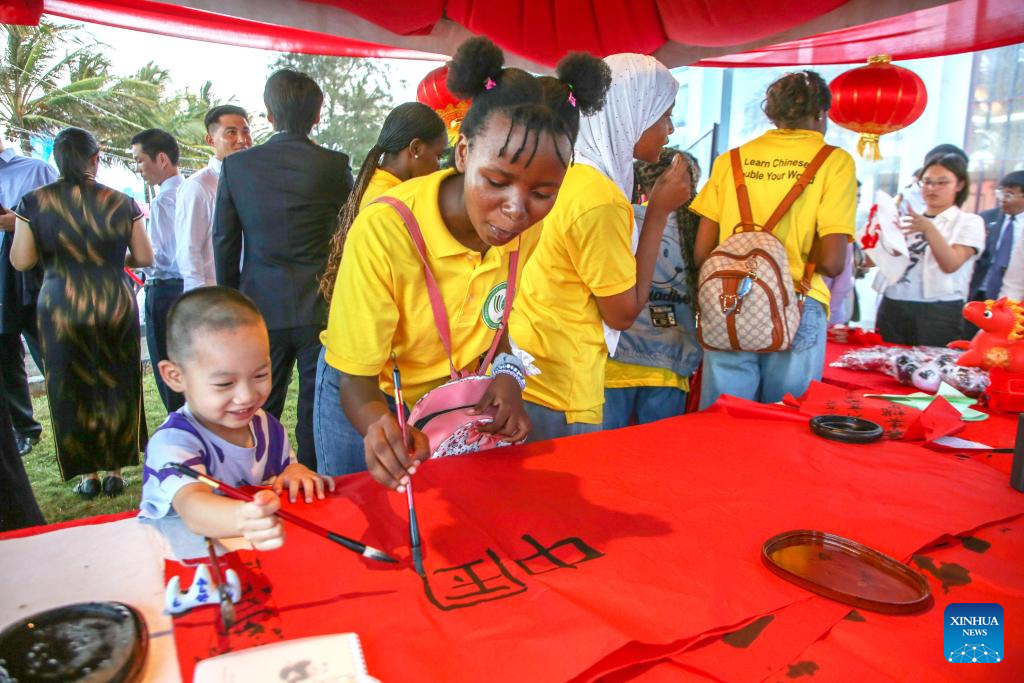 A Tanzanian guest and a Chinese child experience Chinese calligraphy in Dar es Salaam, Tanzania, Feb. 6, 2026. Tanzanians on Friday evening joined overseas Chinese to celebrate the upcoming Spring Festival, also known as the Chinese New Year, at the Chinese Embassy in Tanzania.(Xinhua/Emmanuel Herman)