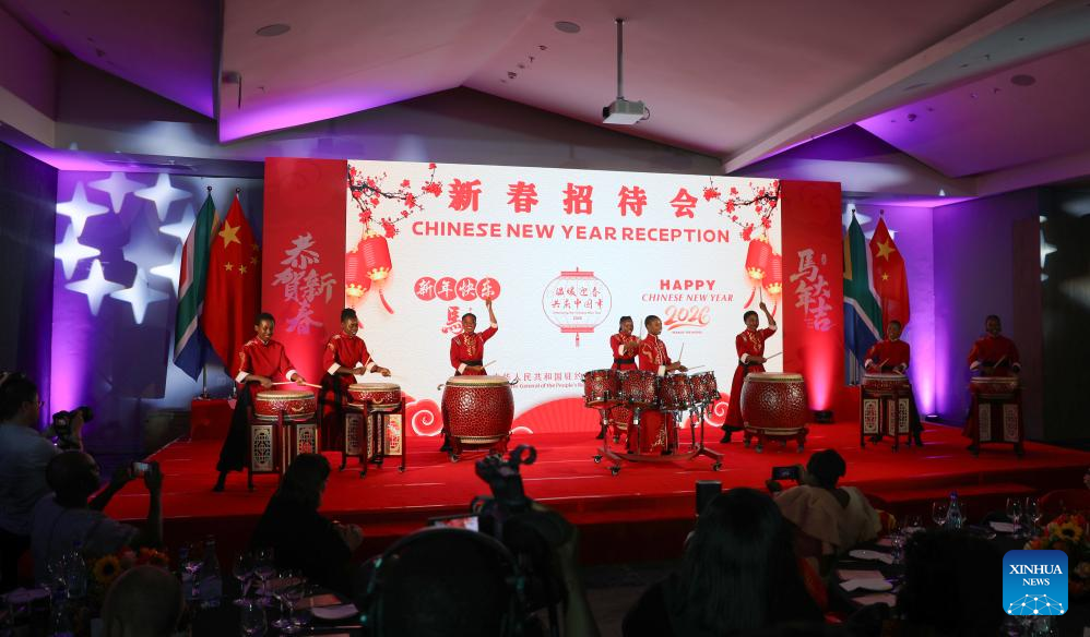 Artists perform a Chinese drum show during a reception to celebrate the upcoming Chinese New Year in Johannesburg, South Africa, Feb. 9, 2026. (Xinhua/Chen Wei)