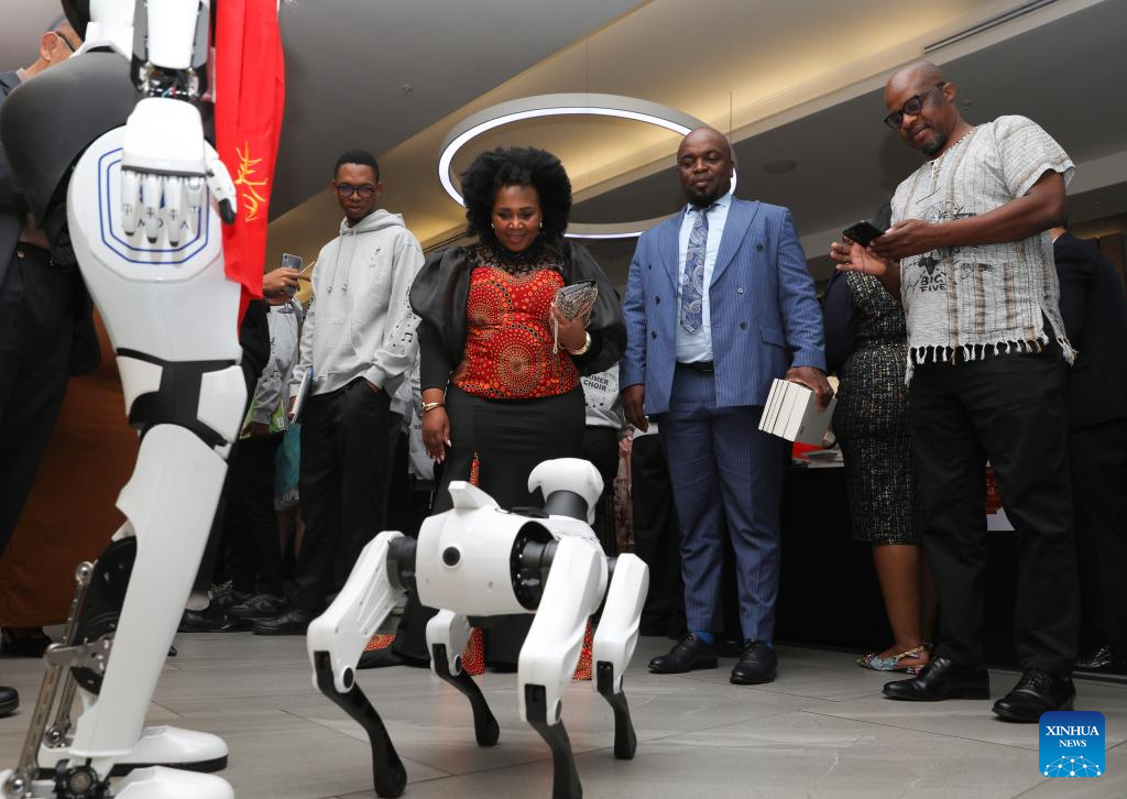 People interact with a robot dog during a reception to celebrate the upcoming Chinese New Year in Johannesburg, South Africa, Feb. 9, 2026. (Xinhua/Chen Wei)