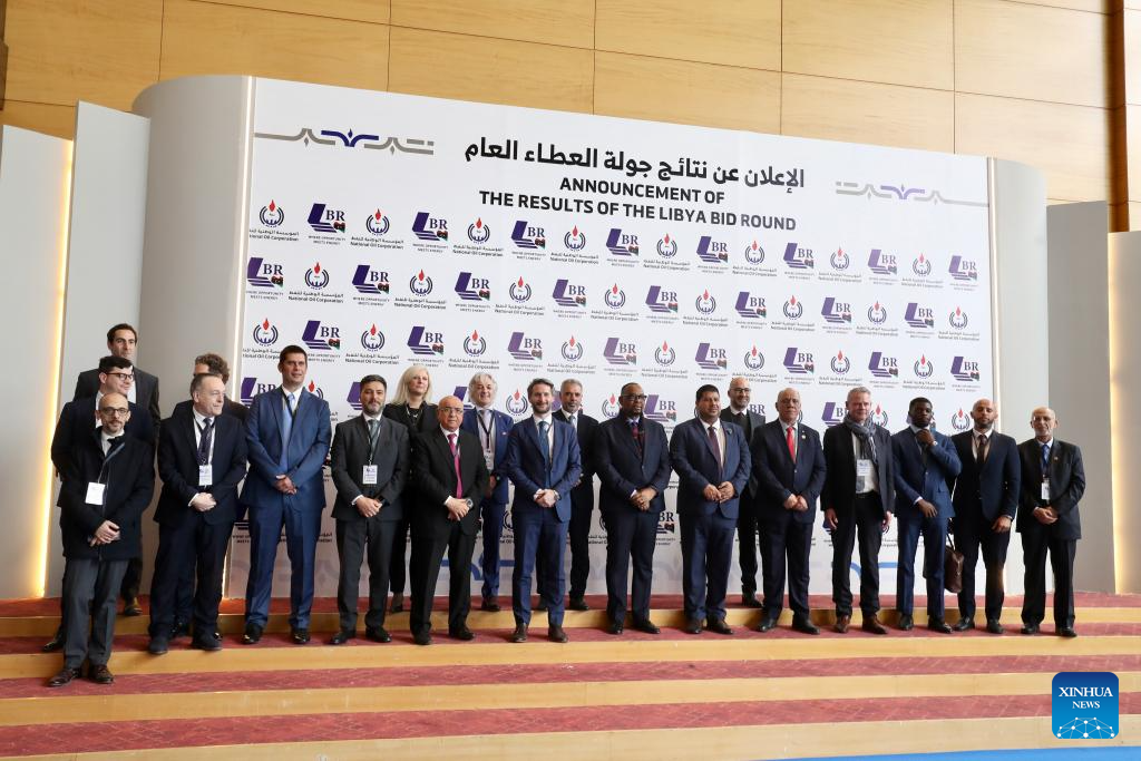 This photo shows the announcement of the results of the Libya bid round held in Tripoli, Libya, Feb. 11, 2026. Libya's National Oil Corporation (NOC) said Wednesday that several international companies have secured oil and gas exploration rights. Five companies from Spain, Hungary, Nigeria, and Italy were awarded exploration blocks in the onshore Sirte and Murzuq basins and the offshore Sirte basin in the Mediterranean, the NOC said. (Photo by Hazem Turkia/Xinhua)