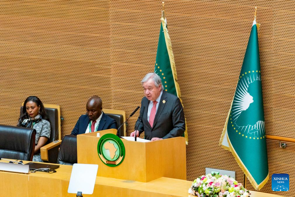 United Nations (UN) Secretary-General Antonio Guterres (1st R) addresses the opening ceremony of the 39th Ordinary Session of the Assembly of Heads of State and Government of the African Union (AU) in Addis Ababa, Ethiopia, Feb. 14, 2026. The two-day summit, which brings together leaders from AU members, was launched under the AU's 2026 theme: "Assuring Sustainable Water Availability and Safe Sanitation Systems to Achieve the Goals of Agenda 2063." (Xinhua/Xie Jianfei)