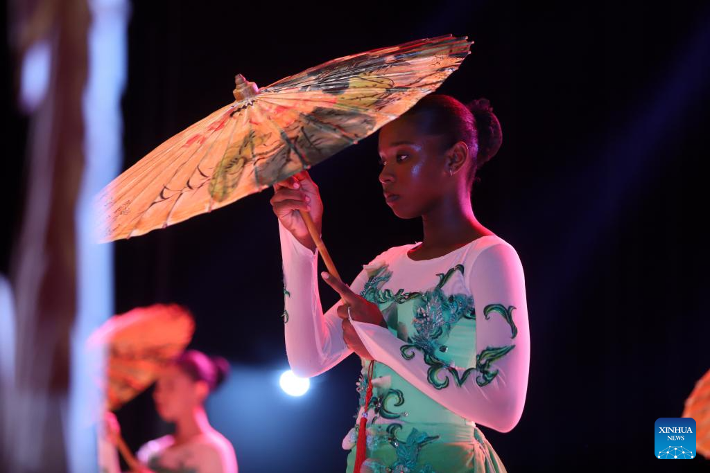 A performer dances during a Chinese New Year gala at the National Auditorium in Praia, capital of Cape Verde, Feb. 14, 2026. (Photo by Elton Monteiro/Xinhua)