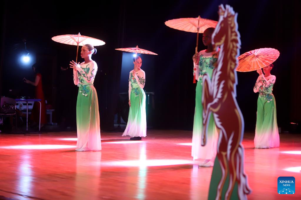 Performers dance during a Chinese New Year gala at the National Auditorium in Praia, capital of Cape Verde, Feb. 14, 2026. (Photo by Elton Monteiro/Xinhua)