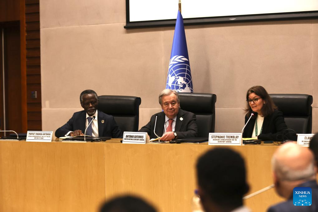 United Nations (UN) Secretary-General Antonio Guterres (C) addresses the media on the sidelines of the 39th African Union (AU) Summit at the AU headquarters in Addis Ababa, Ethiopia, Feb. 14, 2026. (Xinhua/Geng Xinning)