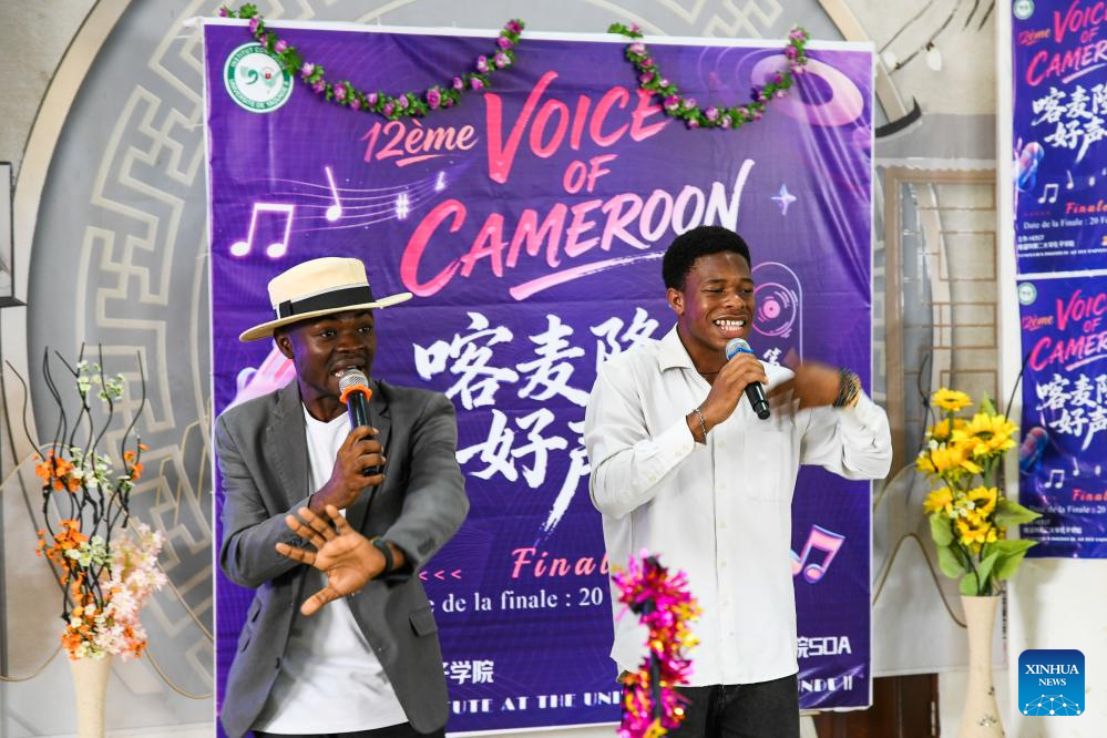 Participants sing a Chinese song in the final of the 12th edition of the "Voice of Cameroon" Chinese song competition at the University of Yaounde II in Soa, Cameroon, Feb. 20, 2026. (Xinhua/Kepseu)
