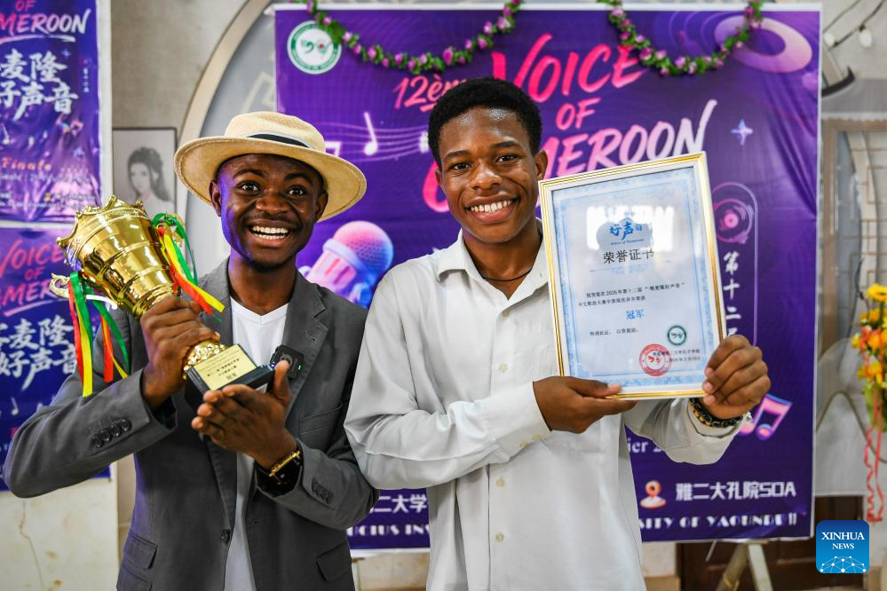 Winners of the 12th edition of the "Voice of Cameroon" Chinese song competition pose with their trophies and certificates at the University of Yaounde II in Soa, Cameroon, Feb. 20, 2026. (Xinhua/Kepseu)