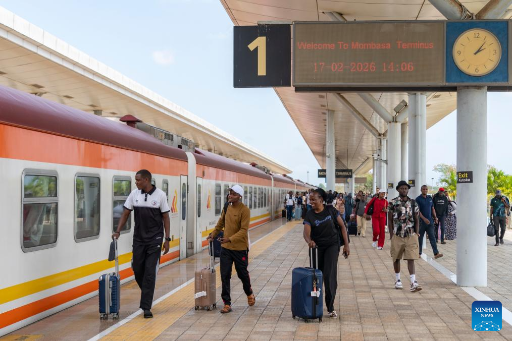 People arrive the Mombasa Terminus of the Mombasa-Nairobi railway in Mombasa, Kenya, Feb. 17, 2026. Stretching 472 km from the port city of Mombasa to the capital Nairobi in Kenya, the Chinese-built Mombasa-Nairobi Standard Gauge Railway (SGR) was launched on May 31, 2017. It is the first new railway built in Kenya since independence and a flagship project of China-Kenya cooperation under the Belt and Road Initiative. (Xinhua/Xie Jianfei)