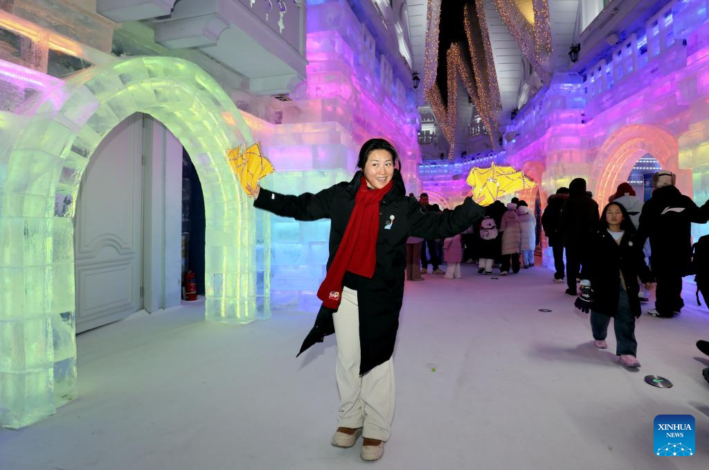 A tourist dances for a video at the indoor ice-and-snow theme park in the Harbin Ice and Snow World in Harbin, northeast China's Heilongjiang Province, Feb. 22, 2026. The indoor ice-and-snow theme park, a facility located within Harbin Ice-Snow World, opened on Sunday as the outdoor Harbin Ice-Snow World officially closed its 27th edition on Saturday. (Photo by Zhang Shu/Xinhua)