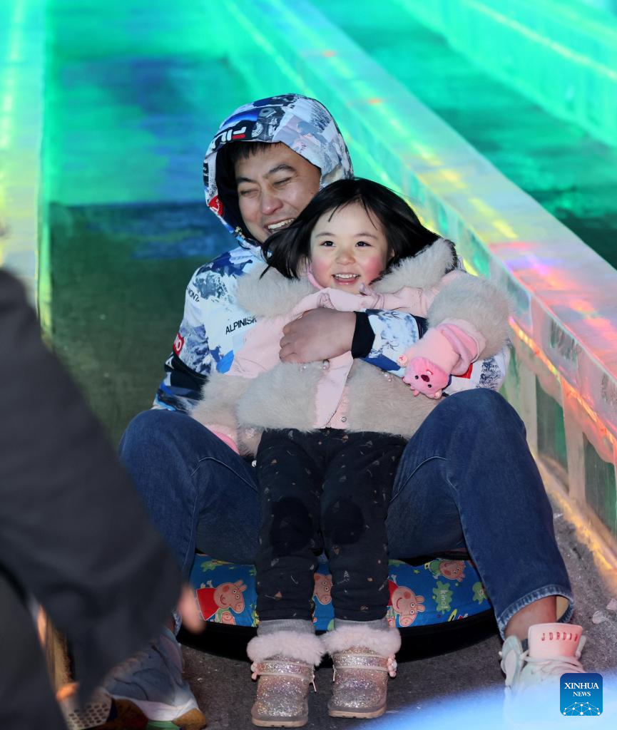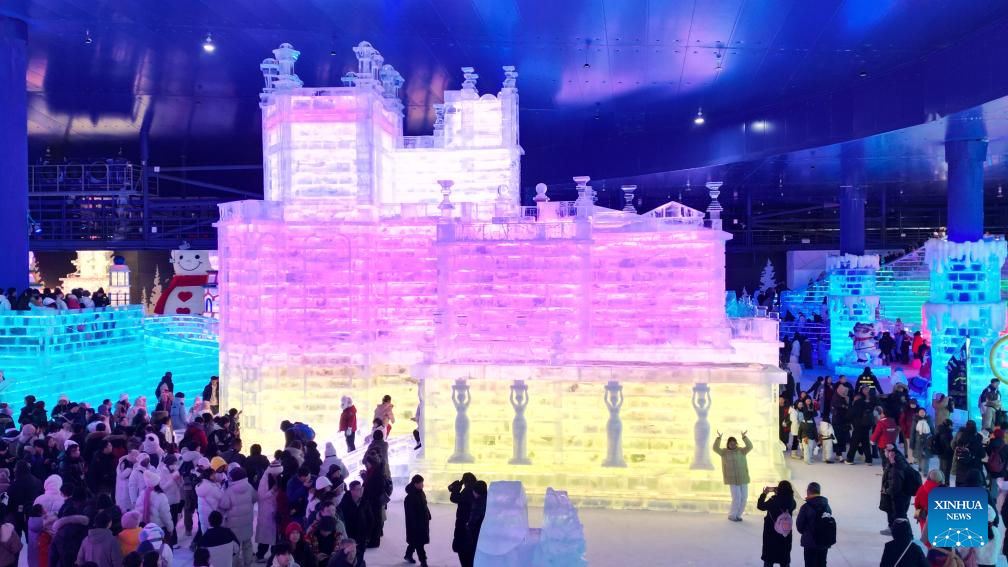 Tourists have fun at the indoor ice-and-snow theme park in the Harbin Ice and Snow World in Harbin, northeast China's Heilongjiang Province, Feb. 22, 2026. The indoor ice-and-snow theme park, a facility located within Harbin Ice-Snow World, opened on Sunday as the outdoor Harbin Ice-Snow World officially closed its 27th edition on Saturday. (Photo by Liu Yang/Xinhua)