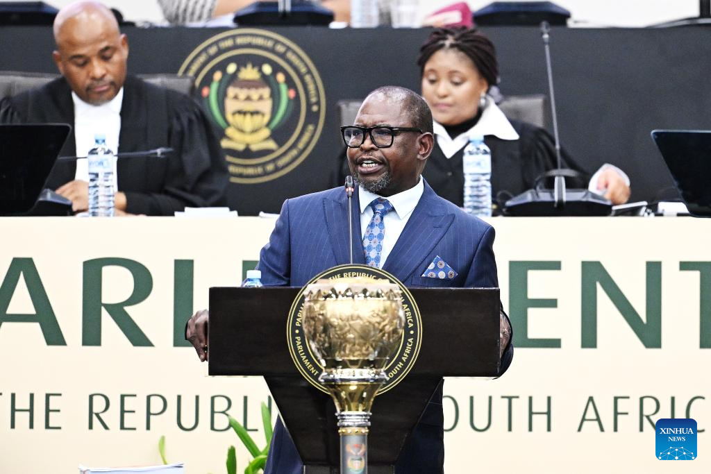 South African Finance Minister Enoch Godongwana delivers the 2026 Budget Speech in Parliament in Cape Town, South Africa, Feb. 25, 2026. South Africa's economy is projected to grow by 1.6 percent in 2026, with the outlook steadily improving, Finance Minister Enoch Godongwana said on Wednesday. (Photo by Xabiso Mkhabela/Xinhua)