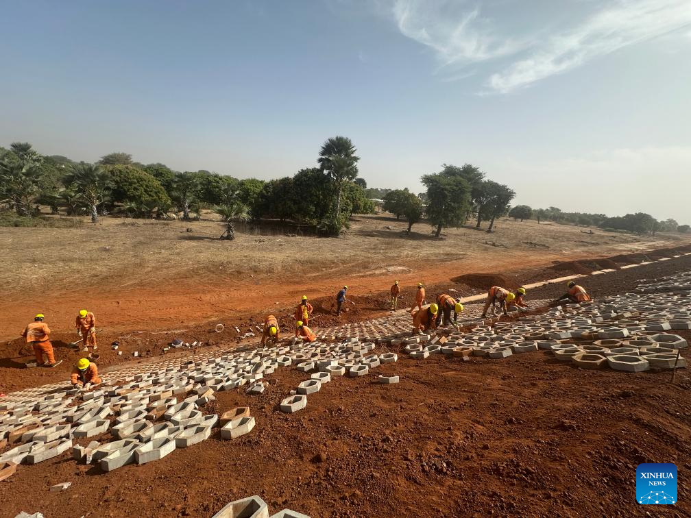 Workers install hexagonal concrete blocks for slope protection at the construction site of the Mbour-Kaolack highway project on the outskirts of Mbour, Senegal, Feb. 24, 2026. Stretching nearly 100 km across western Senegal, the Mbour-Kaolack highway project is approaching completion, with construction teams working to finalize the remaining sections.(China Road and Bridge Corporation/Handout via Xinhua)