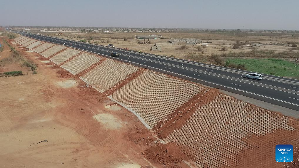 An aerial drone photo taken on March 17, 2024 shows the slope protection work of Mbour-Kaolack highway project in Senegal. Stretching nearly 100 km across western Senegal, the Mbour-Kaolack highway project is approaching completion, with construction teams working to finalize the remaining sections.(China Road and Bridge Corporation/Handout via Xinhua)