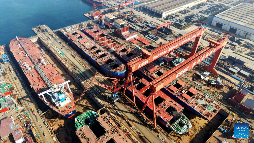 An aerial drone photo taken on Feb. 25, 2026 shows the Haixi Bay Shipbuilding and Marine Engineering Industrial Base in Qingdao, east China's Shandong Province. As production resumes after the Spring Festival holiday, factories and enterprises across the country are operating at full steam to meet orders and ramp up output. (Photo by Yu Fangping/Xinhua)