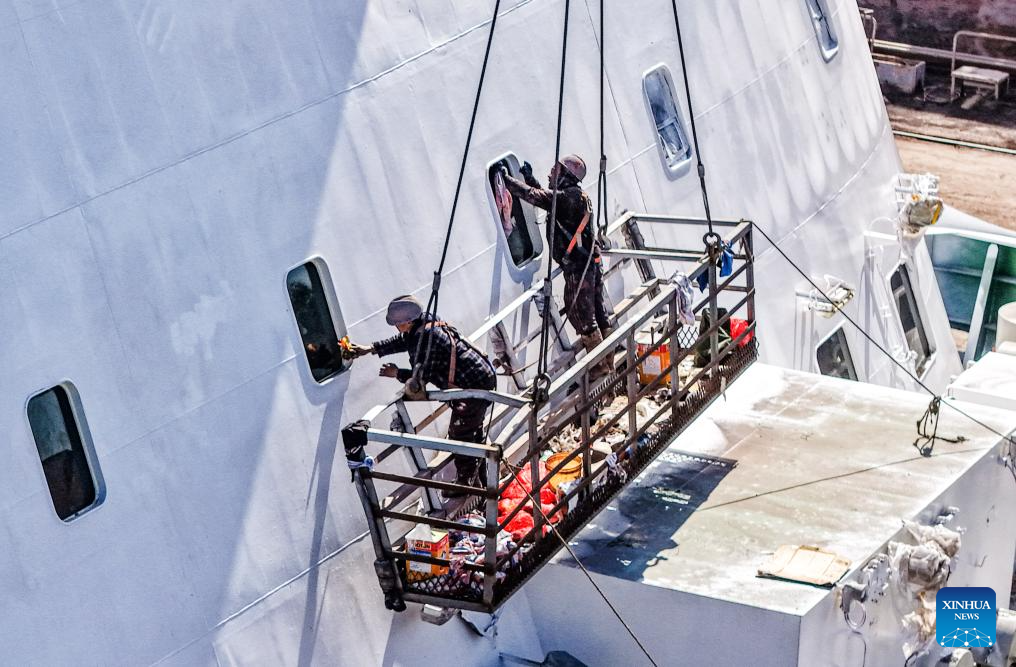 A drone photo taken on Feb. 25, 2026 shows workers cleaning paint residues at a shipbuilding and repairing industrial base in Rongcheng, east China's Shandong Province. As production resumes after the Spring Festival holiday, factories and enterprises across the country are operating at full steam to meet orders and ramp up output. (Photo by Li Xinjun/Xinhua)