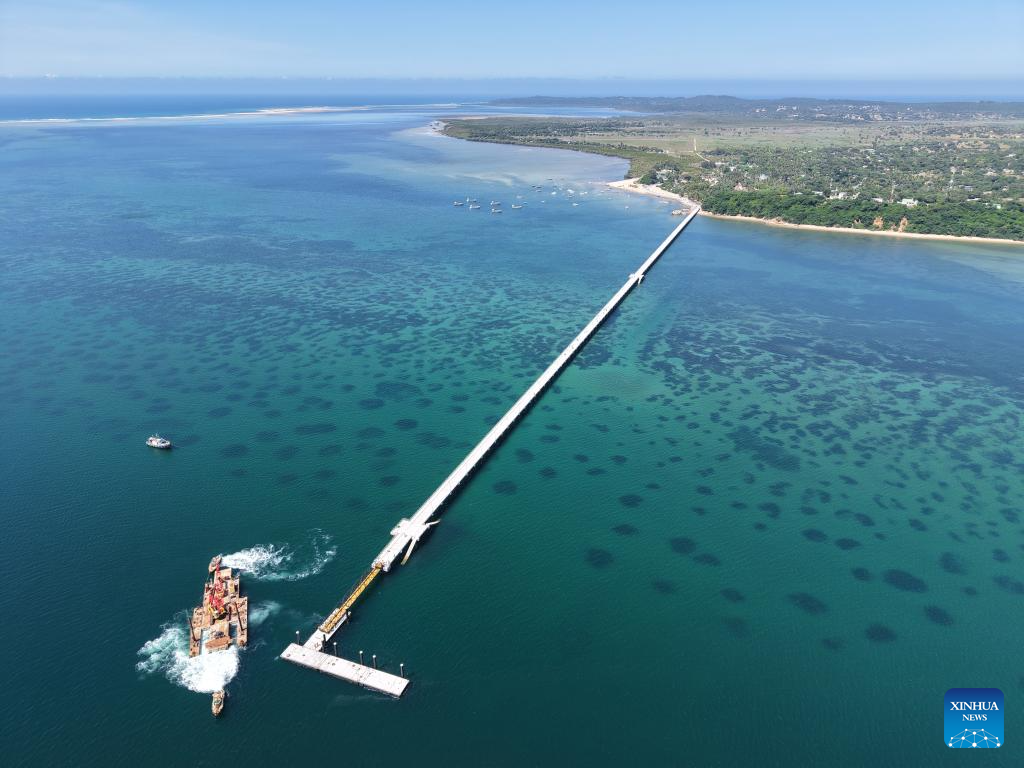 An aerial drone photo taken on March 4, 2026 shows the jetty bridge built by China Road and Bridge Corporation on Inhaca Island in Maputo Bay, Mozambique. The newly completed jetty bridge, with a total length of about 1.3 km, allows passenger vessels to dock under different tidal conditions. Visitors can now reach the island directly via the jetty, improving the safety and efficiency of passenger transport. (China Road and Bridge Corporation/Handout via Xinhua)