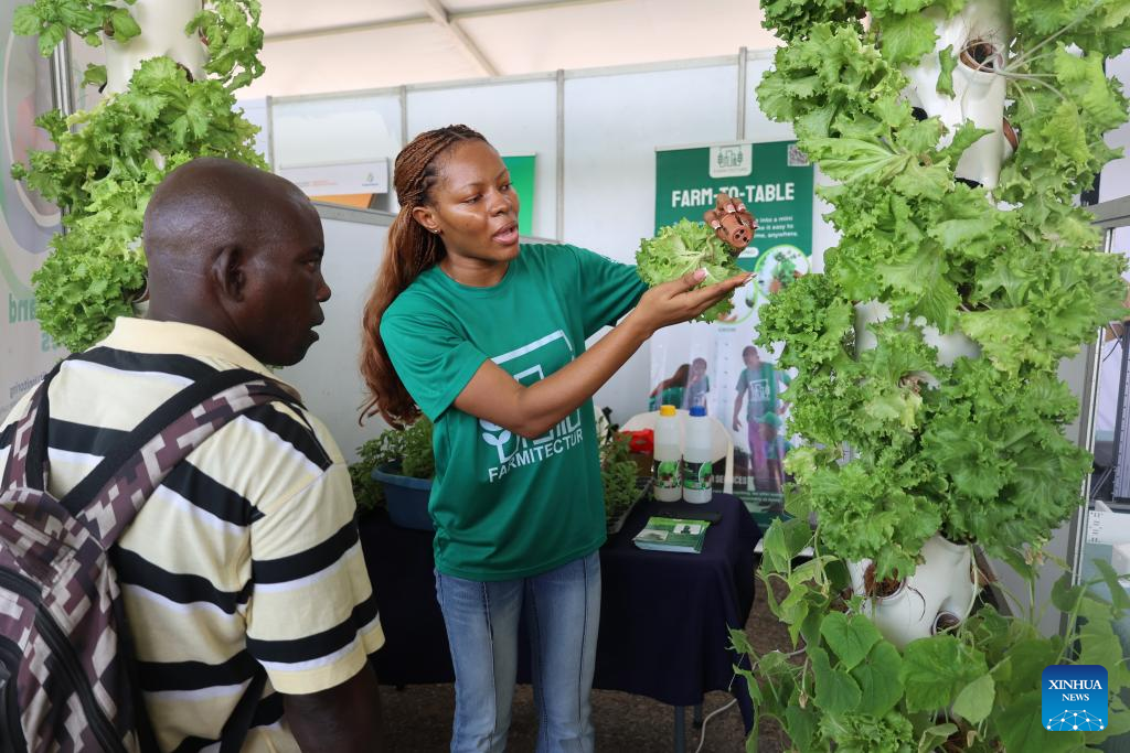 An exhibitor (R) introduces products to a visitor at an agriculture technology fair in Accra, Ghana, March 17, 2026. (Xinhua/Seth)