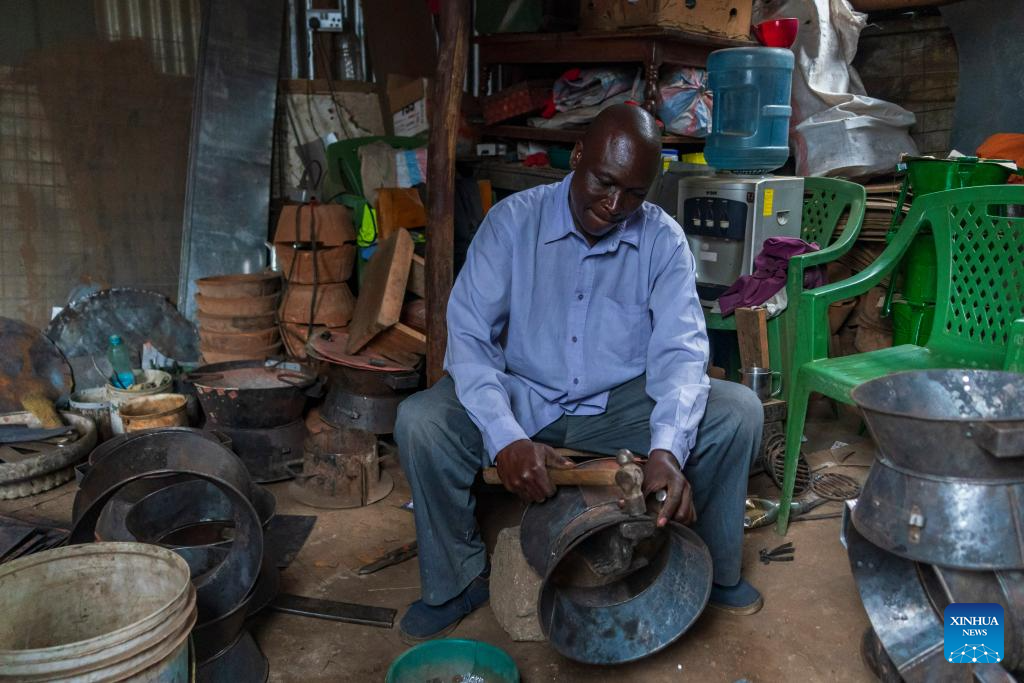 A man makes a metal shell for clay stove in Kisumu, Kenya, Feb. 28, 2026. As the largest freshwater lakes in China and Africa, respectively, Poyang Lake and Lake Victoria have witnessed a cross-continental collaboration for sustainable development and ecological preservation. (Xinhua/Xie Jianfei)