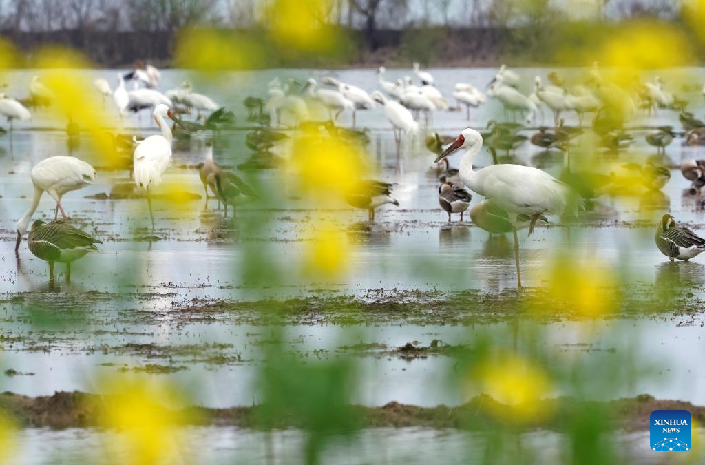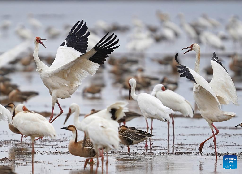 Migratory birds such as white cranes rest at a wetland reserve by Poyang Lake, in Yugan County, east China's Jiangxi Province, Feb. 27, 2026. As the largest freshwater lakes in China and Africa, respectively, Poyang Lake and Lake Victoria have witnessed a cross-continental collaboration for sustainable development and ecological preservation. (Xinhua/Wan Xiang)