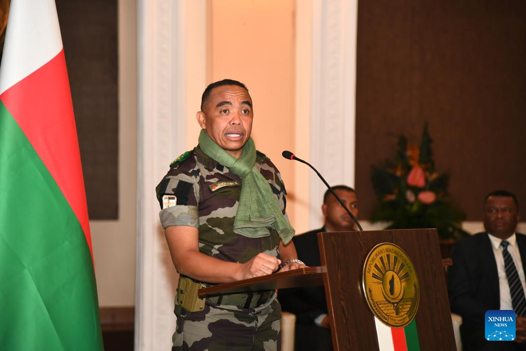 Madagascar's President Michael Randrianirina speaks during the presentation ceremony of the new government at the presidential palace in Antananarivo, Madagascar, March 25, 2026. Madagascar's presidency announced Wednesday evening the appointment of a new government, tasked with strengthening social stability and combating corruption. (Photo by Sitraka Rajaonarison/Xinhua)