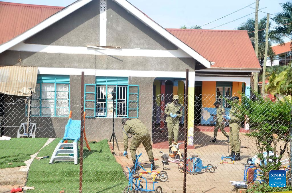 Ugandan police work at the scene where four children were killed in a stabbing incident at Ggaba Early Childhood Development Program School in Kampala, Uganda, on April 2, 2026. Ugandan police on Thursday provided further details on a fatal stabbing incident at Ggaba Early Childhood Development Program School in the capital, Kampala, where four toddlers were killed. (Photo by Nicholas Kajoba/Xinhua)