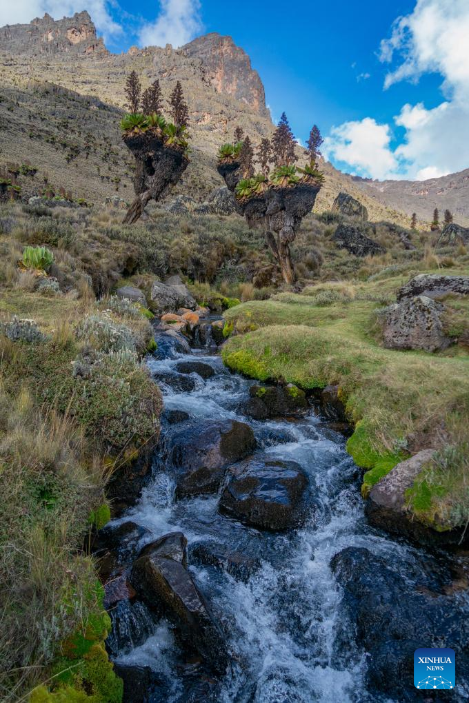 This photo taken on April 11, 2026 shows the scenery in Mount Kenya National Park, Meru County, central Kenya. Located close to the Equator in central Kenya, Mount Kenya is the second-highest mountain in Africa as its highest peak, Batian, reaches 5,199 meters.