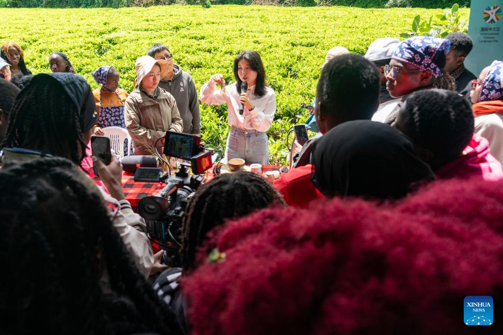 A teacher from the Confucius Institute at the University of Nairobi introduces tea art for students at a tea garden in Kiambu County, Kenya, April 15, 2026.