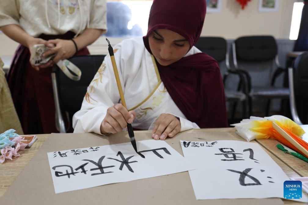 A student experiences Chinese calligraphy during a celebration marking the 2026 International Chinese Language Day in Algiers, Algeria, April 20, 2026. The celebration was held on Monday at the University of Algiers 2 in Algeria, attracting over 600 Algerian students and Chinese language enthusiasts. (Xinhua)