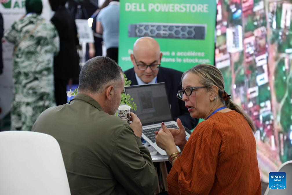 Participants communicate at the ICT Africa Summit in Algiers, Algeria, April 21, 2026. The ICT Africa Summit kicked off on Tuesday in Algiers, bringing together policymakers, industry leaders and startups to explore Africa's accelerating digital transformation and the future of its technology ecosystem. (Xinhua)