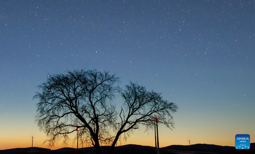 This photo taken on April 14, 2026 shows the comet C/2025 R3 in the sky over Huachuan County of Jiamusi City, northeast China's Heilongjiang Province. (Photo by Zhu Zongqiang/Xinhua)