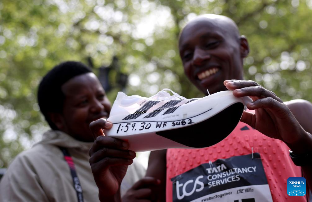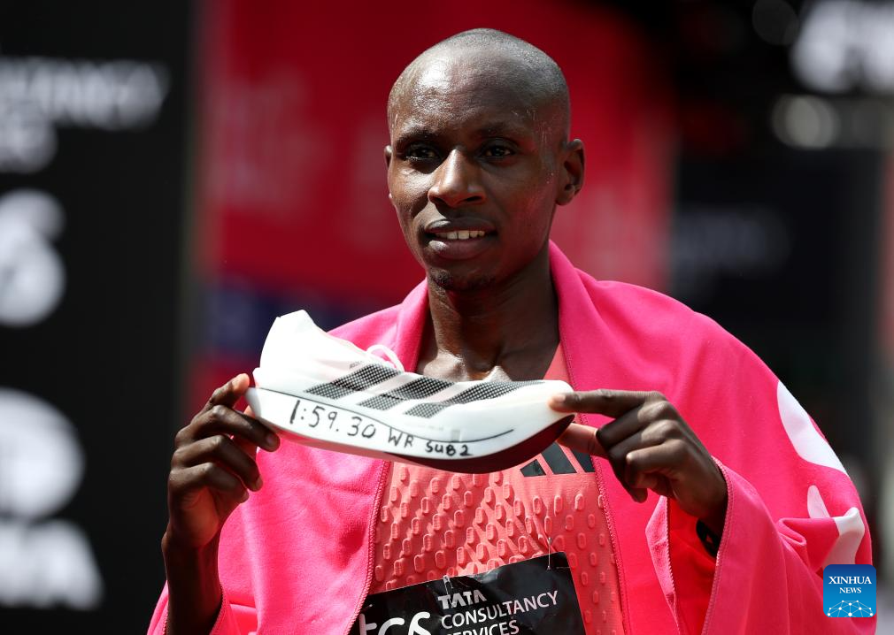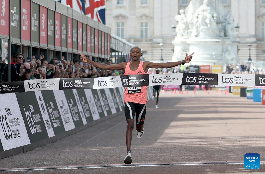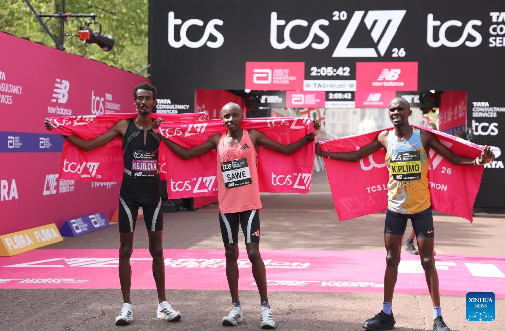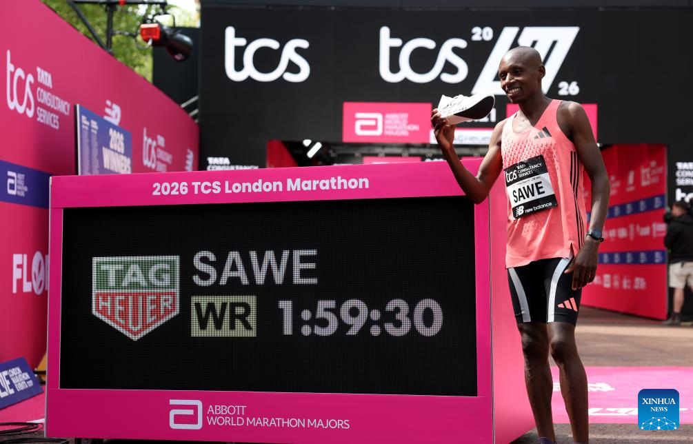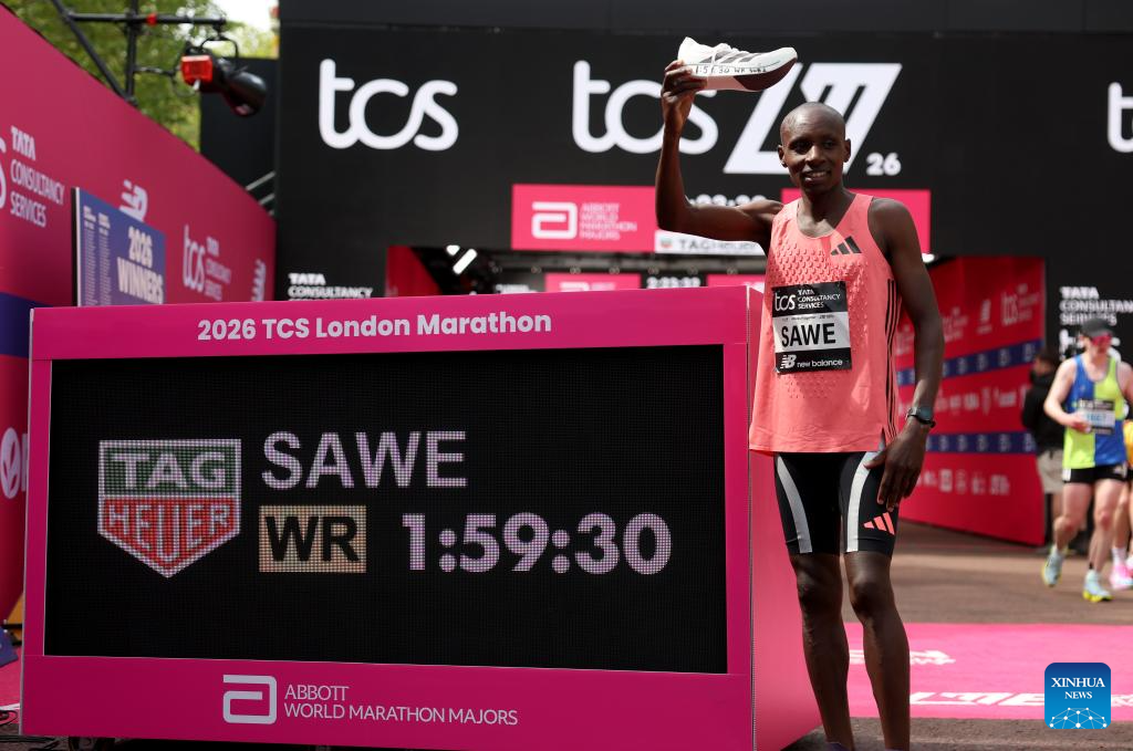 LONDON, April 26 (Xinhua) -- Kenya's Sabastian Sawe clocked a winning time of one hour, 59 minutes and 30 seconds in the 2026 London Marathon on Sunday, becoming the first man to run a marathon in under two hours.